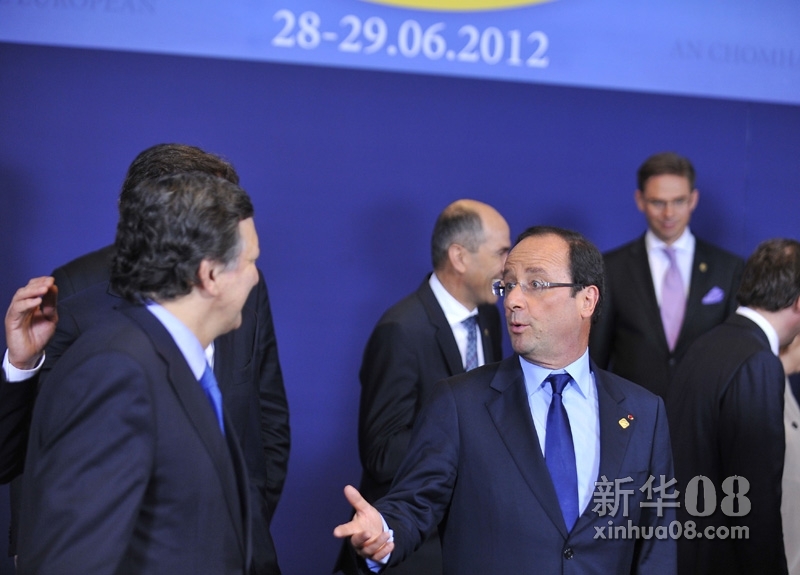 6月28日,出席欧盟峰会的法国总统奥朗德(右)和欧盟委员会主席巴罗佐交谈。