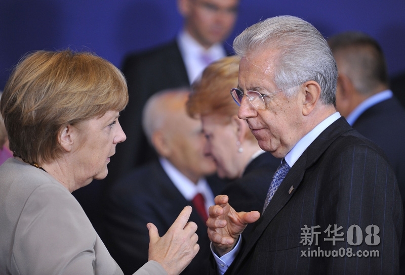 6月28日,出席欧盟峰会的德国总理默克尔(左)和意大利总理蒙蒂交谈。