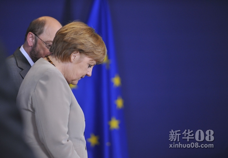 6月28日,出席欧盟峰会的德国总理默克尔(右)和欧洲议会议长·舒尔茨交谈。